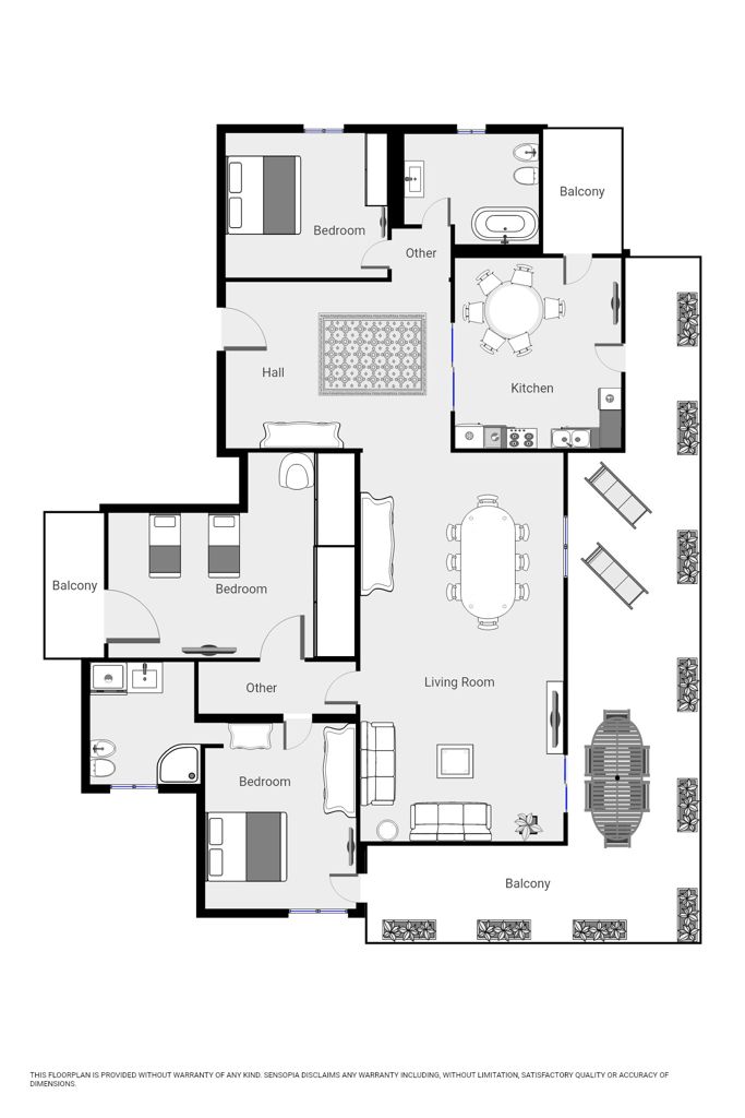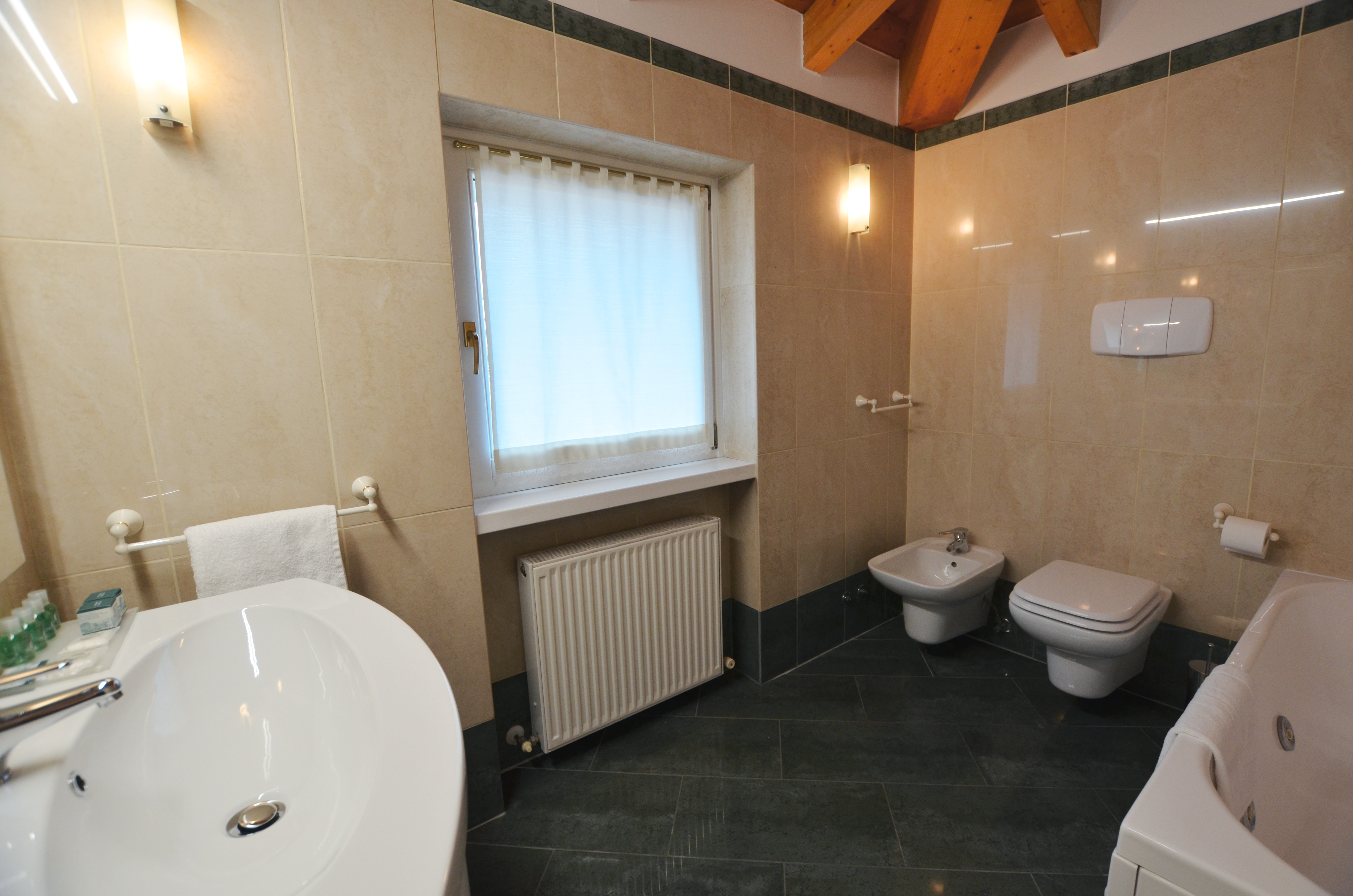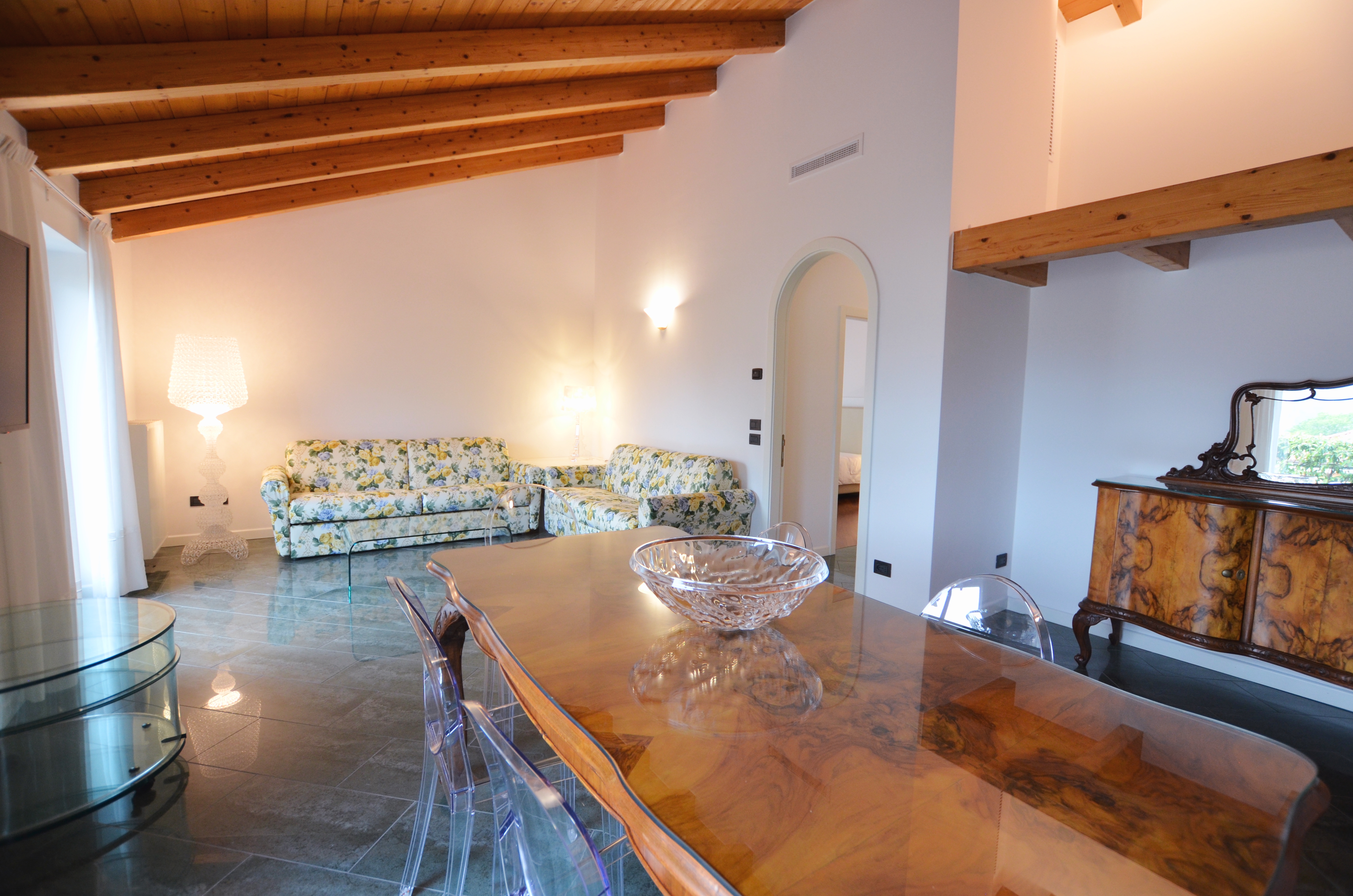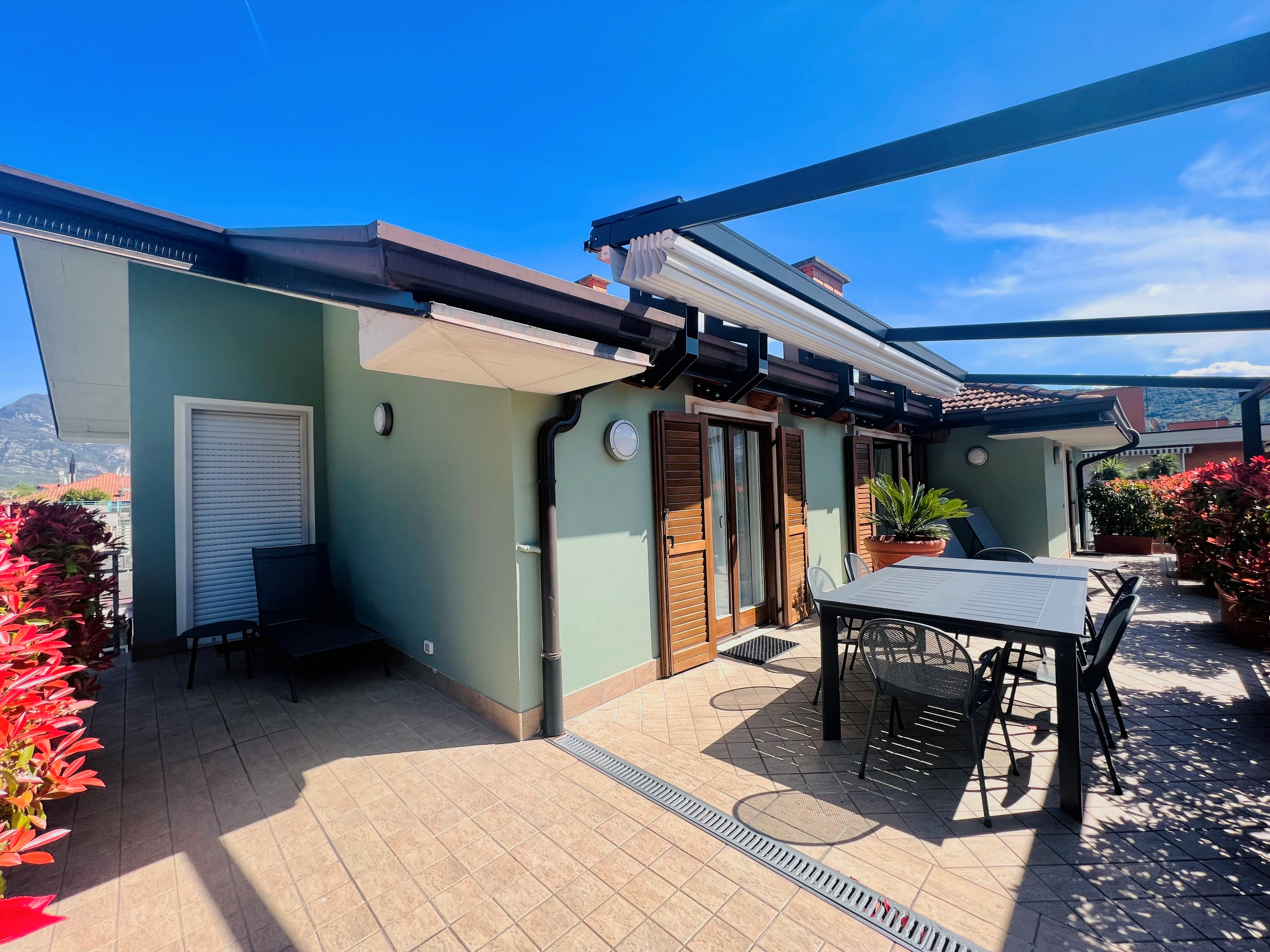 Dotato di 3 camere con 1 letto matrimoniale oppure 2 singoli, cucina con tavolo e sedie completa di tutta l'attrezzatura necessaria, lavastoviglie forno e forno microonde, soggiorno con divano letto matrimoniale, connessione Wi-Fi gratuita, aria condizionata, 5 TV sat/HD, 2 bagni, uno con doccia/wc e lavatrice e uno con vasca Idromassaggio Whirlpool/wc, ampia terrazza con veranda arredata con tavolo, sedie e lettini prendisole.